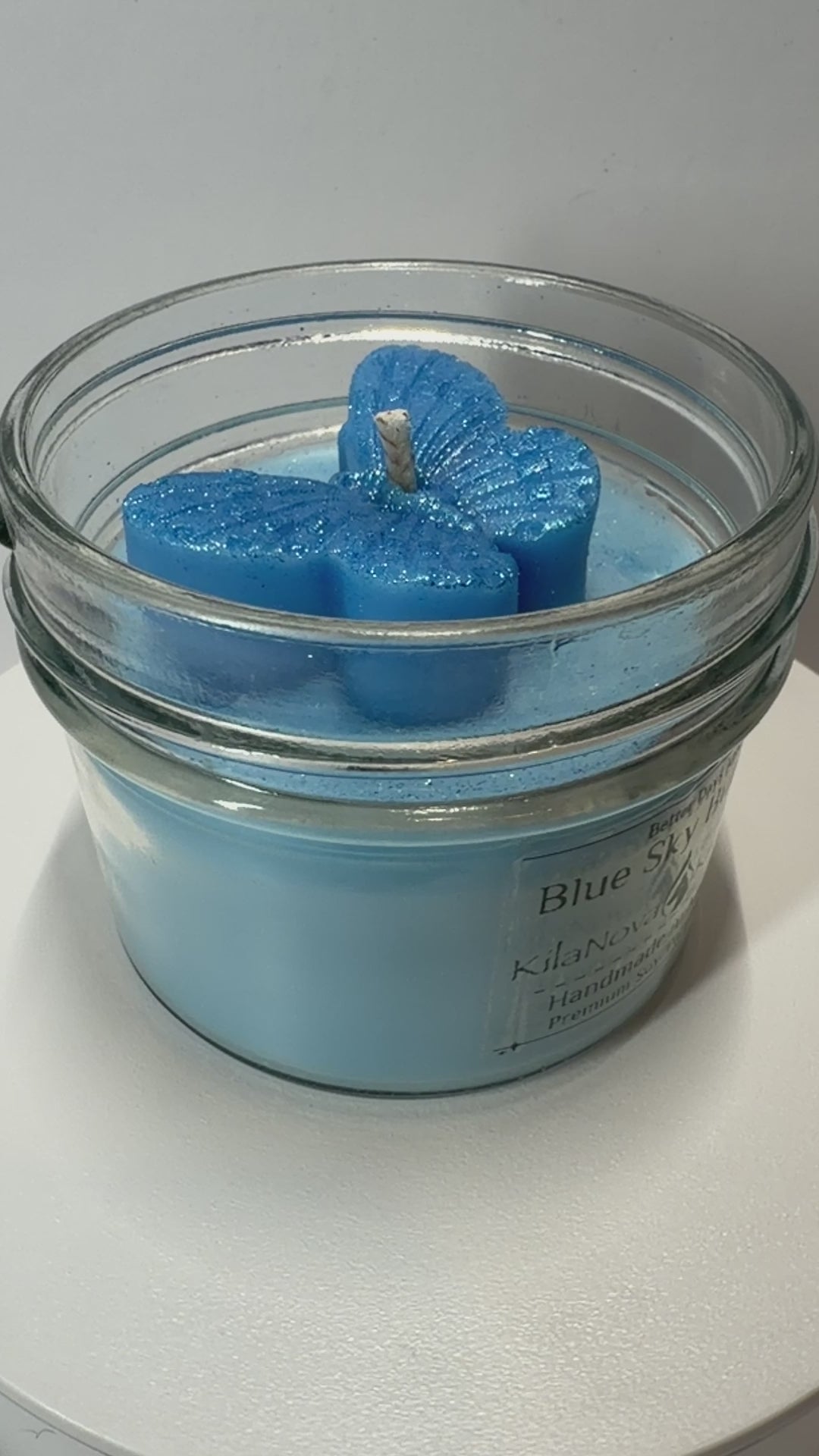 A beautifully sculpted butterfly wax design sits atop soft blue wax, symbolizing transformation, renewal, and brighter days ahead. As it burns, the candle releases a gentle, comforting fragrance that fills your home with warmth and positivity.