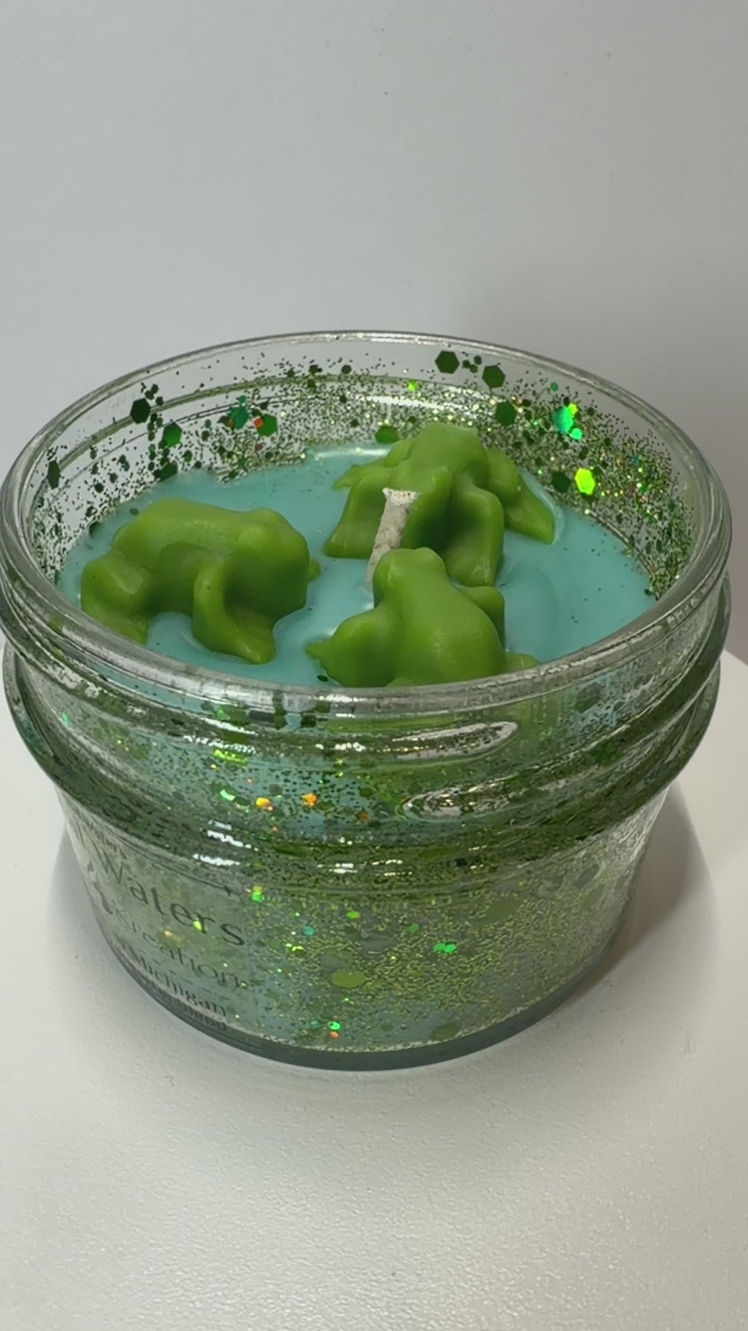 The cool blue wax base is accented with vibrant green wax details and shimmering flecks, evoking drifting islands suspended over glowing water. Hand-poured in Michigan using a premium soy/paraffin blend, Orbital Waters is both a statement piece and a breath of fresh air for any space.