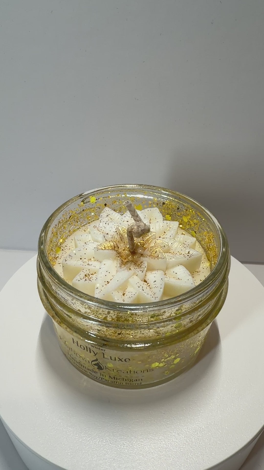 OR Festive elegance with a golden glow. Holly Luxe is a winter-inspired statement candle designed to bring warmth, sparkle, and seasonal magic into your space. Featuring a sculpted floral wax design dusted with shimmering gold accents, this candle feels cozy yet elevated — perfect for holiday styling or winter nights in.