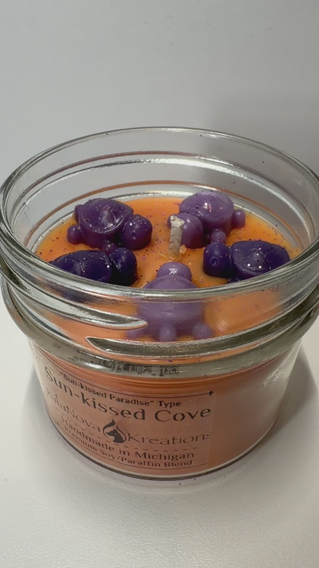 The rich orange wax base is topped with deep violet accents, creating a striking contrast that feels both playful and luxurious. Hand-poured in Michigan using a premium soy/paraffin blend, Sun-Kissed Cove is perfect for brightening your space and setting a relaxed, beachy mood any time of year.